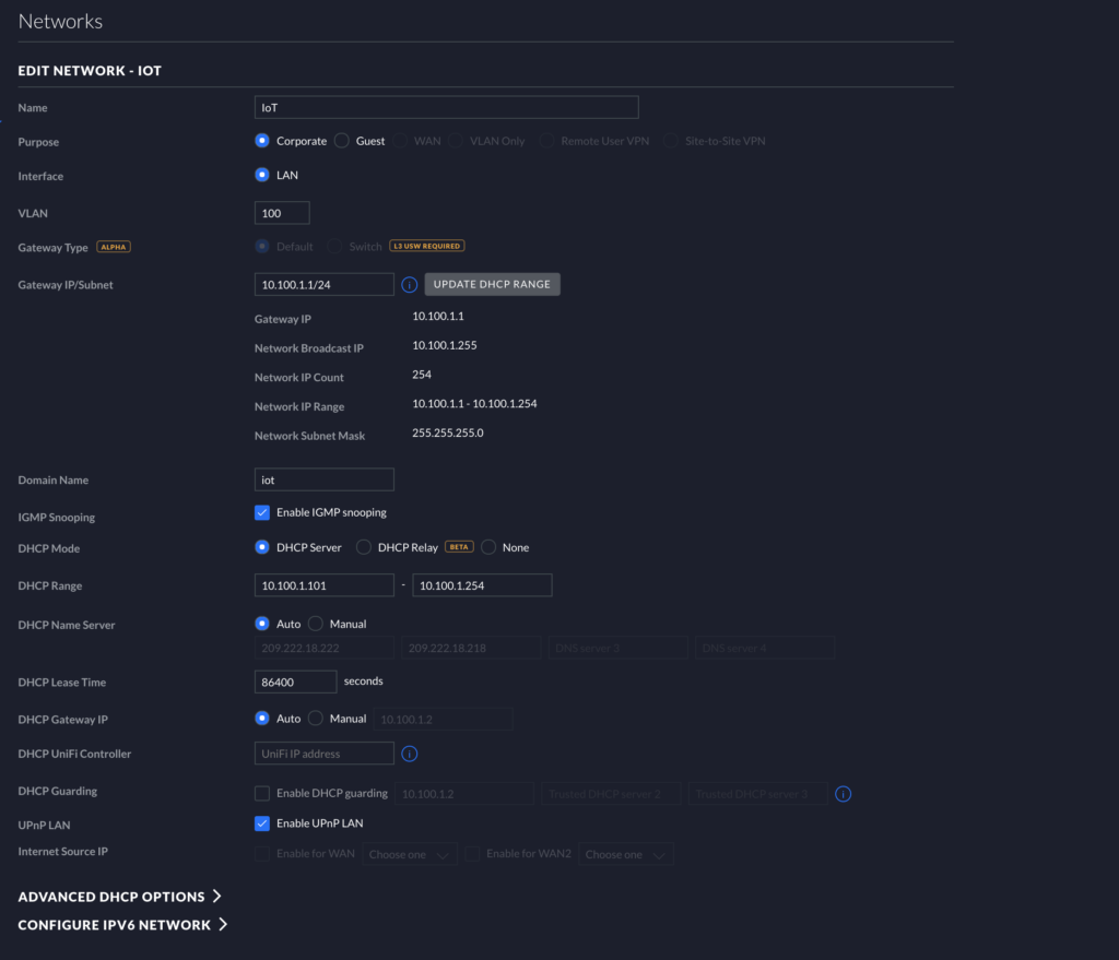 The first step is creating a VLAN for your IoT network. The easiest way to accomplish this task is to create a new subnet for your IoT network. For example, if you currently just have a single network for all of your Internet-connected devices, including your personal computers, phones, etc, you probably have a single subnet that looks something like this: 192.168.1.1/24. This is seen on your Unifi Controller by going to Settings > Networks (on the old GUI). I recommend you next click “Create New Network,” and name the network something like “IoT”. Specifically select “Corporate” for the “Purpose.” It makes it easy to remember if you set the Gateway IP/Subnet 1 number off from your default network (e.g., set it to something like 192.168.2.1/24 or 192.168.10.1/24). Below, you will see my settings. Notice my Gateway is 10.100.1.1. My default subnet is 10.100.0.1, in contrast. For simplicity, I have IGMP snooping and UPNP enabled. This might help down the road for certain smart components like Home Assistant. For VLAN, set any number from 2-4018. I set my DHCP range to only include x.101-x.254 because I wanted to reserve the first 100 IPs in this subnet for static addressing. If you want all your devices to be DHCP, you do not need to modify this option. Go ahead and save this network.