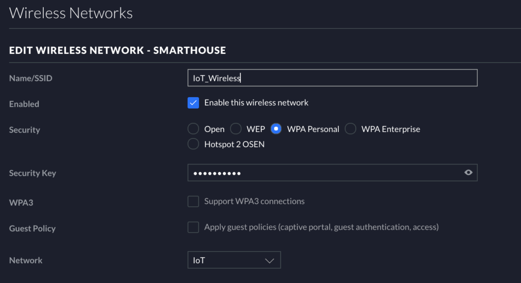 Since most IoT devices are wireless, you will need to create a wireless SSID for all of your IoT devices to connect to separately from the rest of your home network. Go to Settings -> Wireless Networks, and click “Create New Wireless Network.” Name the SSID something memorable, and set the security to “WPA Personal” (old GUI…the new GUI may allow you to specifically choose WPA2, in which case, do that). For “Network,” choose the subnet/VLAN you made in the previous step. This will associate the new SSID to that particular network segment.