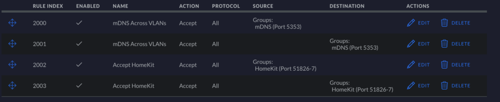 HomeKit I have a Port Group with ports 51826 and 51827 for HomeKit. Make your own rules and match your settings to the image below. All you will need to do is change your source/destination like in the image below (Rules 2000-2003) to allow HomeKit communications. You can more finely tune this particular rule by granularly allowing different source/destination combos (e.g., source: IoT, destination: home), but I am currently simply allowing any source/destination combo to communicate over HomeKit ports.