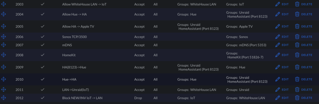This portion can get complicated depending on how specific you want to be with allowances of devices between these network segments. I have a lot of different home automation programs running like HomeBridge and Home Assistant. I also have Sonos speakers, which need their own rules to function properly with your iPhone on a different subnet. If you have some IoT devices (no Sonos) without any external programs like HomeBridge, the only rules you will need to concern yourself with are 2003 and 2012.