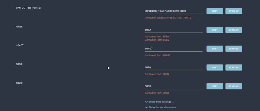 To do this, go to your VPN container’s settings. In settings, add your ports to the VPN_OUTPUT_PORTS option (this may be different if you are not using Privoxyvpn). Then, map each port directly to the container by selecting “Add another Path, Port, Variable, Label or Device” at the bottom container’s settings page. Change “Config Type” to “Port”. Next, add the original port from your container under the “Container Port:” option. Then, add the port you would like mapped to the container to access that port under “Host Port:”. For example, if you want to access Nitter’s port 8080 on 8082, “Container Port:” will be 8080 and “Host Port:” will be 8082. Otherwise, you can make these two ports match for ease of setup. See the image below for an example.
