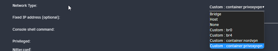 The next step is to route your containers through the new network you just created. To do this, go to the settings page of the container you would like to route and edit the “Network Type” on the container. Here, choose the new network you just created (e.g., privoxyvpn) (see image below).