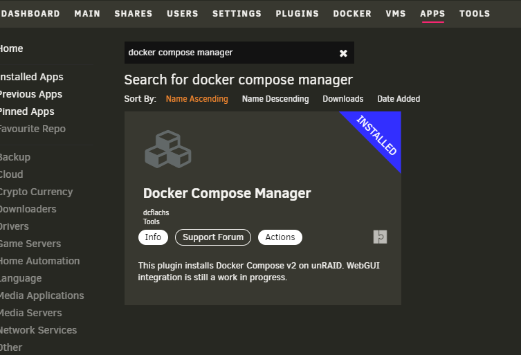 In order to use this particular setup, you will first need to install Docker Compose Manager. You can install Docker Compose Manager on Unraid from the Community Applications page. Simply search “Docker Compose Manager” and install the package from “dcflachs”. Check out the forum post for Docker Compose here. See the image below.