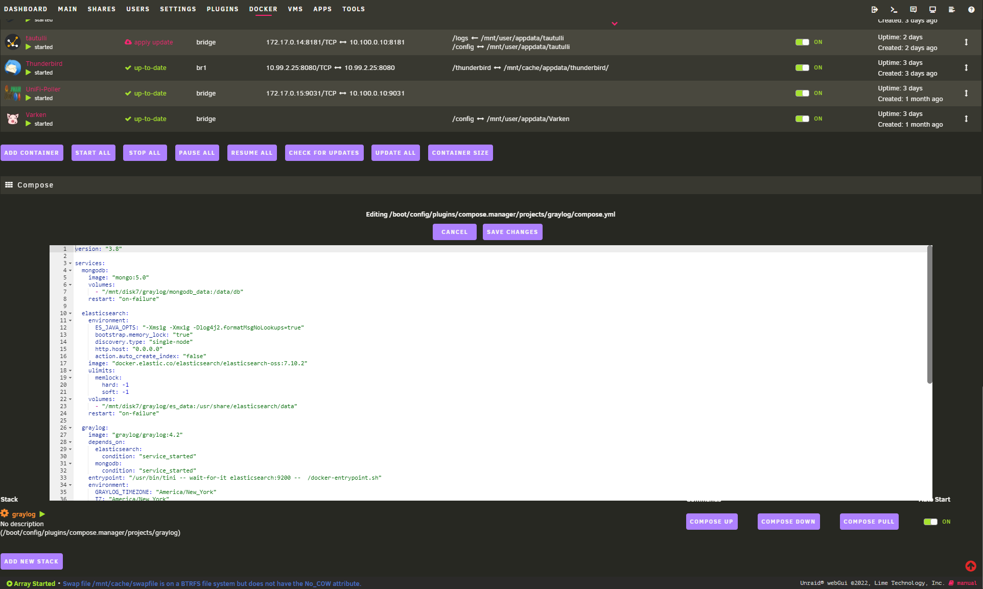 Next, click the gear icon next to your “graylog” stack, and select EDIT STACK. I new large text edit box should appear, and you will see something like “Editing /boot/config/plugins/compose.manager/projects/graylog/compose.yml”. Copy and paste the code below into the box: