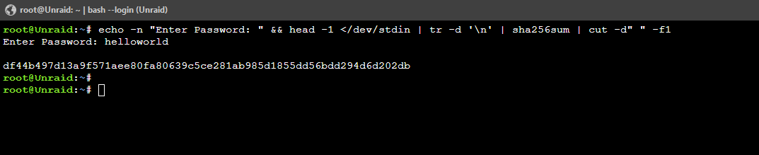 Finally, before saving, you must create a password and a SHA2 hash of the password. These values go on Lines 38 and 39 respectively. For this, I actually used another Docker container on Unraid called CyberChef (mpepping/cyberchef). You also can use terminal on Unraid. Click the Terminal icon on Unraid in the top right of the menu. Copy and Paste the following: