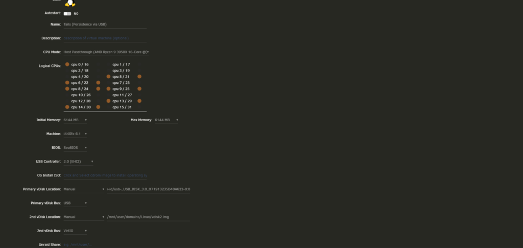 In Unraid’s VM manager, select “ADD VM.” From there, select “Linux.” Select the core distribution and RAM allotment that makes sense for your purposes. For Machine, select “i440fx-6.1.” For Bios, select “SeaBIOS.” For USB Controller, select “2.0 (EHCI).” For Primary vDisk Location, select “Manual” and paste the location of your USB from earlier (e.g., <strong>/dev/disk/by-id/usb-_USB_DISK_3.0_xxxxxxxxxxxxxxxxxx-0:0</strong>). For 2nd vDisk Location, select Auto or define your vDisk as needed (this will be the Persistence storage disk), and select the 2nd vDisk BUS to be “VirtIO”. See the image below.